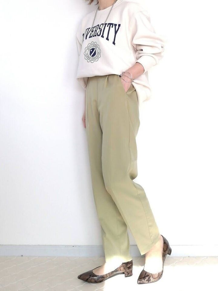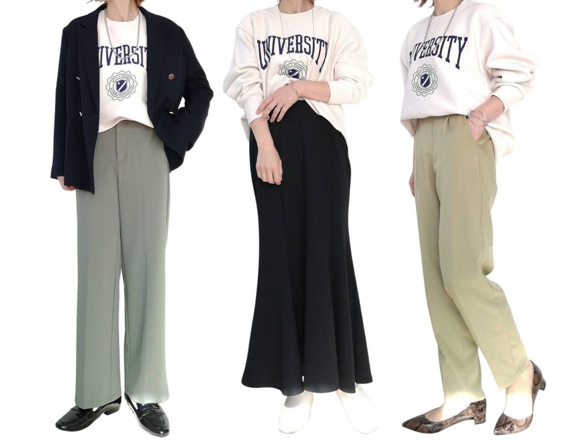 アラフォー世代は、きれいめ多め・カジュアル度少なめのバランスがおすすめ。ロゴスウェットがカジュアルなので、その他のアイテムはきれいめなアイテムを選ぶと吉!!