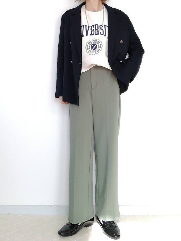 マニッシュな着こなしにカジュアルなロゴスウェットを1点投入することで、こなれた雰囲気のおしゃれが完成します。
