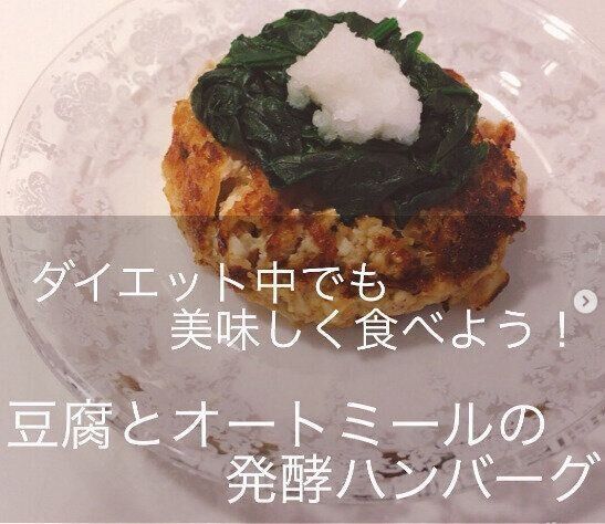 ダイエット中でもおいしく食べられる工夫をするのが、ダイエット継続の秘訣。koh_50さんのハンバーグは豆腐とオートミールでつくるハンバーグです。フライパンでみじん切りにしたしょうが1かけ、玉ねぎ1/2個、キノコ類を炒め、塩、コショウをふりボウルに移します。そこにしっかりと水切りをした木綿豆腐1丁と、オートミール1カップ、米粉大さじ2、しょうゆ麹大さじ2を入れて混ぜます。形を整えて焼けばできあがり。しょう油麹でしっかりと味もついているので大満足。食べることを我慢したくはないので、こんな風においしく食べられるように工夫をしているそう。