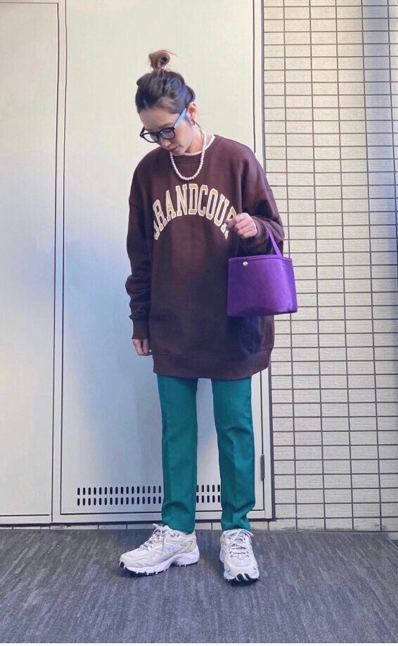 グリーンを合わせることで、普段着に見えがちなスウェットもおしゃれなお出かけファッションの仲間入りできちゃいます。