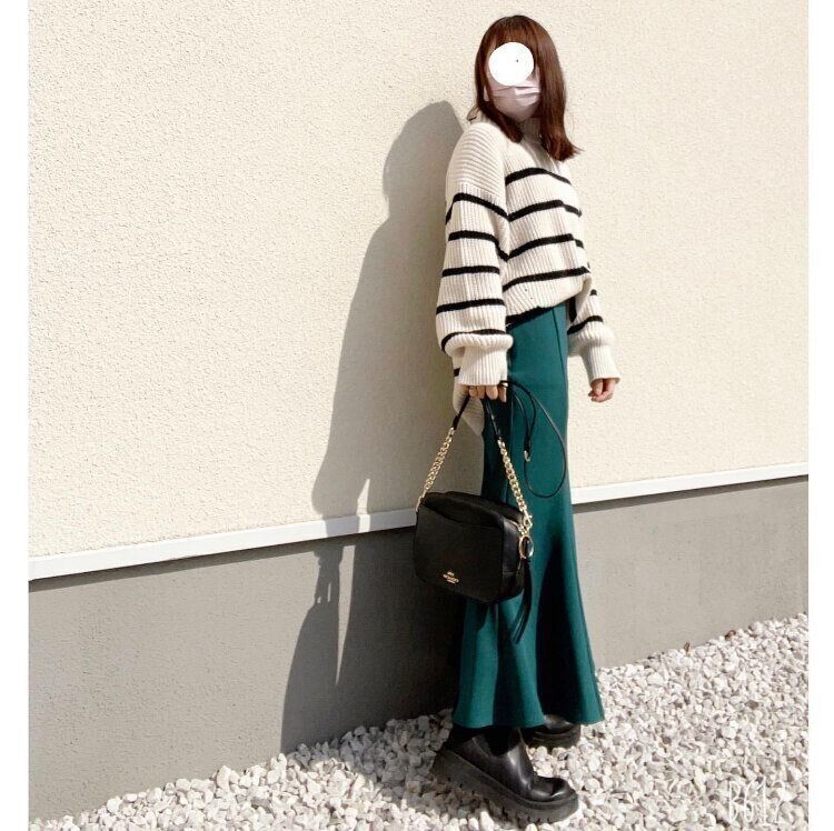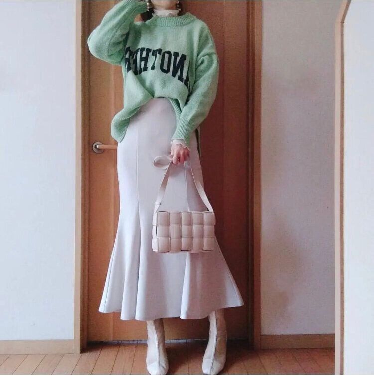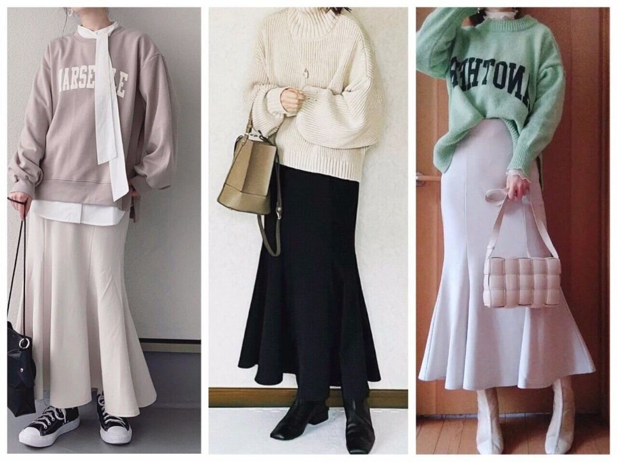 マーメイドスカートは定番のアイテムとも相性がいいので、クローゼットのアイテムを取り入れつつトレンドをおさえたファッションが楽しめます。