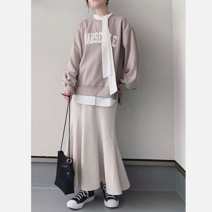 合わせ方によっては着ぶくれしてしまう実はバランスがむずかしいオーバーサイズのスウェットも、「カットソーマーメイドロングスカート」ならコンパクトにまとまりシルエットもきれいに着こなせます。