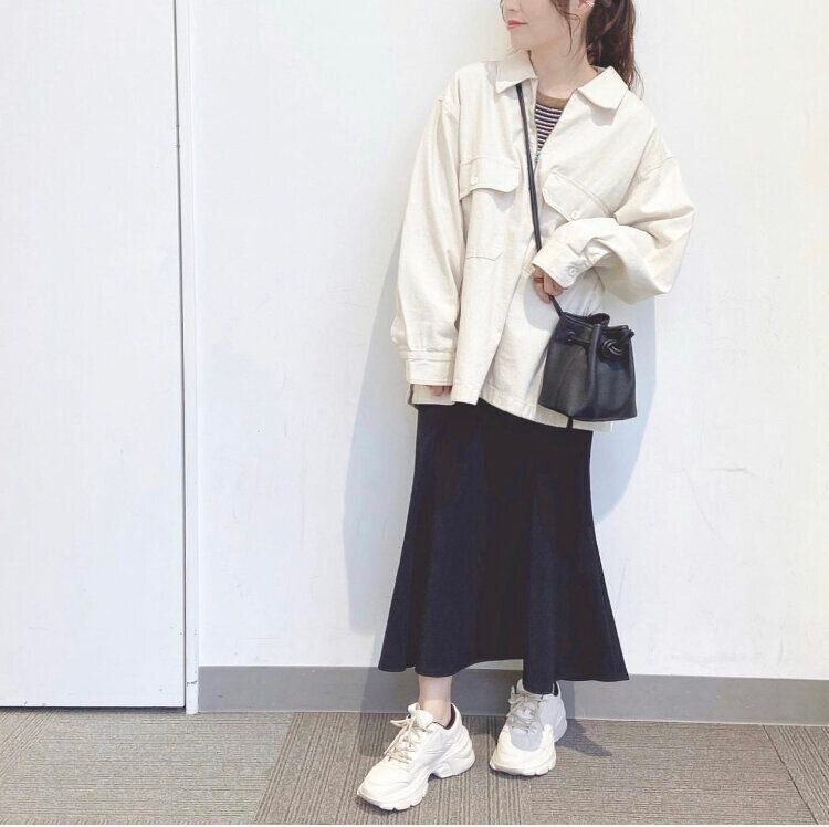 オーバーシャツと「カットソーマーメイドロングスカート」を合わせれば、メンズライクになりがちなアイテムを女性らしいファッションに見せる上級者MIXコーディネートが完成。
