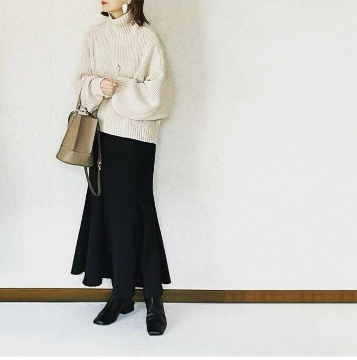 初めてマーメイドスカートにトライするという人はマネしやすいモノトーンコーディネートがマスト。大人の女性だからこそ着こなせるシックな印象も与えることができるのでおすすめです。