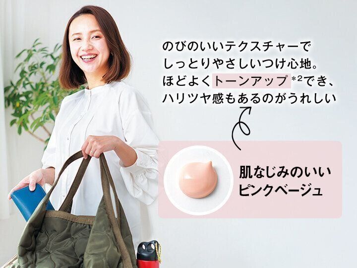 「のびのいいテクスチャーでしっとりやさしいつけ心地。ほどよくトーンアップ*²でき、ハリツヤ感もあるのがうれしい」(足立さん)