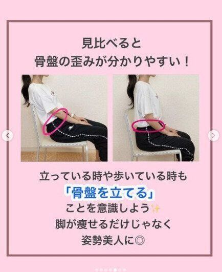 su1__diet_さんいわく、足が太い人は「骨盤がゆがんでいる=座り方に問題」のある人が多いのだそう。正しい座り方は、単純に背筋を伸ばすだけではなく、まずは骨盤を立てて座ることが大切。写真右側のように椅子に深く腰かけ、ひざが90度になるように座ります。腰に手をあてて骨盤を立てる感覚を覚えましょう。立っているときも歩いているときも、この「骨盤を立てる」を意識してあげるといいそうですよ。