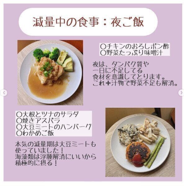 食事制限では満足を得ることができず、リバウンドや過食につながってしまうこともあるそう。こちらの写真はある日の夕食メニューです。栄養バランスを重視し、1日で不足していた食材は夕食でとるようにしています。このほかに汁物を加えることで野菜も補っています。間食もヘルシーな食材をつかって手作りしたりと、ダイエット中でも我慢せずに楽しく食べることを心がけているそう。