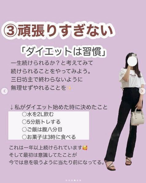 su1__diet_さんは「ちりつも習慣」、つまり少しずつでも続けていけば結果が出るダイエットが基本。「こまめに水をのむ」「市販のお菓子は買わない」「姿勢を意識する」「1分でも体を動かす」という4つです。どれも簡単なことばかりですが、継続することが大切だと言います。ただ、市販のお菓子を買わないというのは、はsu1__diet_さんが思う独自のルール。小さいころからお菓子が大好きで依存症になっていると自覚したからこそ、このルールをつくりました。対処法として、あえて高級なお菓子を選ぶことにしてみたところ、買う頻度も減り、だらだらと食べることもなくなったのだそう。自分の太る原因をみつけて、よい習慣に変えていきましょう。