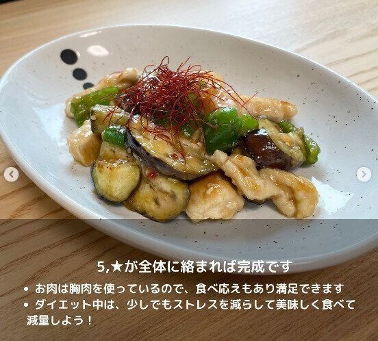 調理師免許をもつcocokitchen24さん。ダイエット成功の大きなポイントは食事だと言います。材料や調理方法を工夫したヘルシーなレシピはぜひとも真似してみたい!まずは、こちらの鶏むね肉をつかったヘルシーな「麻婆ナス」をご紹介しましょう。まずはナス1個とピーマン2個を乱切りにし、片栗粉大さじ1を全体にまぶします。鶏むね肉1枚をひとくち大に切って片栗粉をまぶしたら、ごま油を入れたフライパンに胸肉、野菜の順番に火を入れていきます。火が通ったら、酒、醤油を大さじ1、ニンニクと生姜を3cmほど、豆板醤と鶏がらスープの素を小さじ1入れ、炒めたらできあがりです!