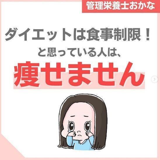 okana_dietさんいわく、食事制限はダイエットになりません。代謝がさがり、脂肪を燃やす栄養素が不足するのでやせることにはつながらないのです。ダイエットに必要なことは、バランスのよい食事をとること。自律神経を整える糖質。筋肉のもとになるタンパク質。ホルモンの材料になる脂質。腸内環境を整える食物繊維。代謝をうながす鉄、マグネシウム、ビタミンB群などを必要量とるということなのです。ただ、エネルギー源となる糖質、タンパク質、脂質はとりすぎるとカロリーオーバーになってしまいます。だからこそバランスのよい食事が大切なのです。