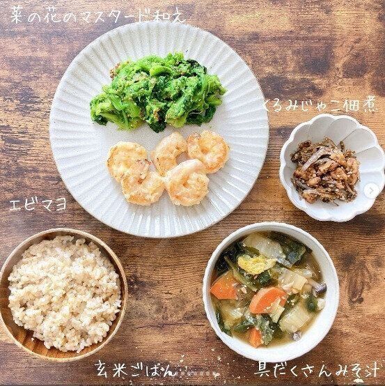 こちらは、玄米ごはんにしたパターン。マグネシウムとビタミンB1が豊富に含まれる玄米。食べづらい人は白米と玄米を混ぜて炊いてもOKです。メインディッシュにそえられているのは旬の菜の花です。野菜は、旬のものを選ぶと栄養価がさらにアップしているのでおすすめなのだそう。そして、味噌汁はいつも具だくさんなのがポイント。たっぷりと野菜がとれるだけでなく、温かい汁物は体もほっとしますね。