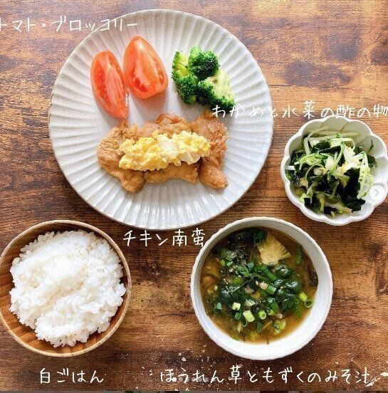プロがつくる献立から「バランスのよい食事」のコツを覚えていきましょう。こちらの写真、メインディッシュはチキン南蛮です。電子レンジの機能をつかった「あげないチキン南蛮」なのだそう。味噌汁には、ほうれん草ともずくがたっぷり。1食のうち1品は、海藻やきのこを意識してとるといいそうですよ。たっぷりと食べごたえのあるメニューで、心も体も大満足できそうですね。