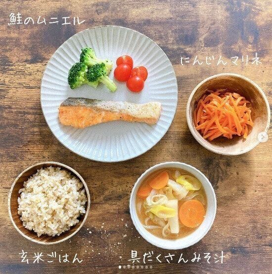 鮭はたんぱく源になるだけでなく、現代人が不足しがちなビタミンDが豊富にふくまれた食材。さらに抗酸化力の強いアントシアニンも豊富ということで、okana_dietさんの冷凍庫にも鮭が常備されているのだとか。そして、にんじんマリネも今日のメニューのポイント。酢をつかった料理は胃酸の分泌を促進し、消化を助けてくれるのでおすすめなのだそう。
