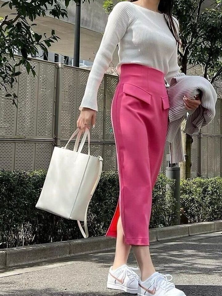 こちらのスカートは、ZARAの「フラップディテール ペンシルスカート/5,990円」。一見、着こなしのむずかしく見えるビビッドなピンク色ですが、ほかアイテムを白に統一すれば大丈夫。