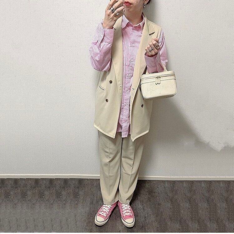 気になりつつも、濃いめピンクに自信が持てないなら、ピンク色のコンバースから始めてみませんか?とくに、ベージュ系のパンツと抜群の相性。しまむらのピンク色のシャツとそろえると、より統一感がアップできます。