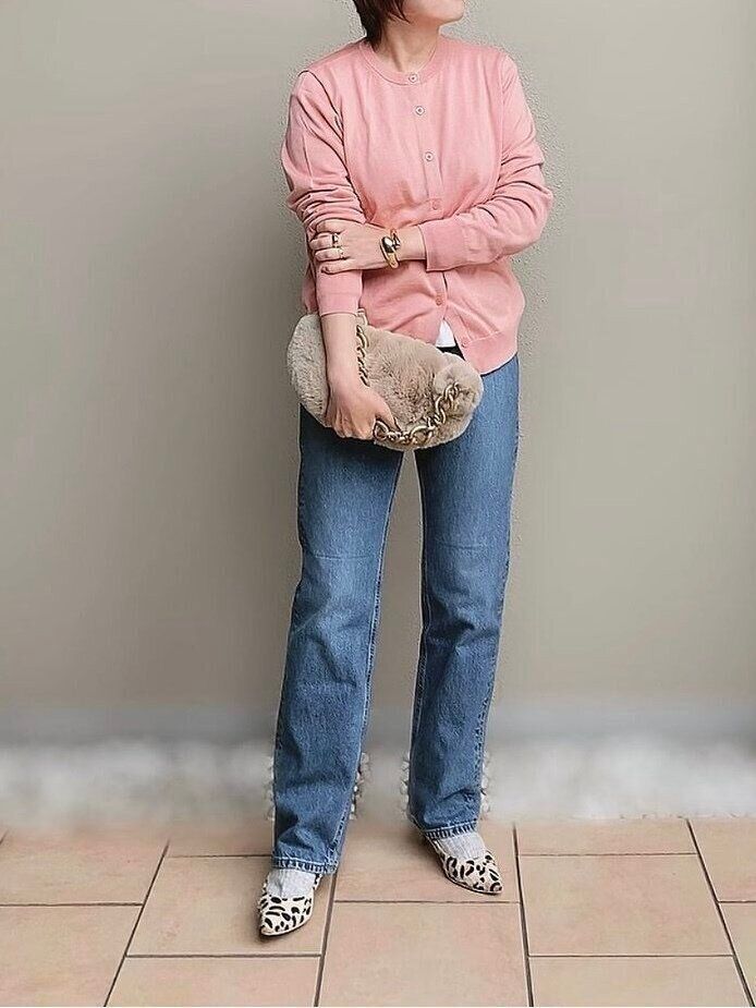 春らしくて、気兼ねないピンクコーデをしてみたいなら、手持ちのデニムにユニクロの「UVカットクルーネックカーディガン/2,990円」を合わせてみましょう。くすんだトーンのピンク色で、デニムのカラーを問わず合わせやすく◎。UVカット機能つきなので、意外にも紫外線の多い初夏以降も大活躍するはず!