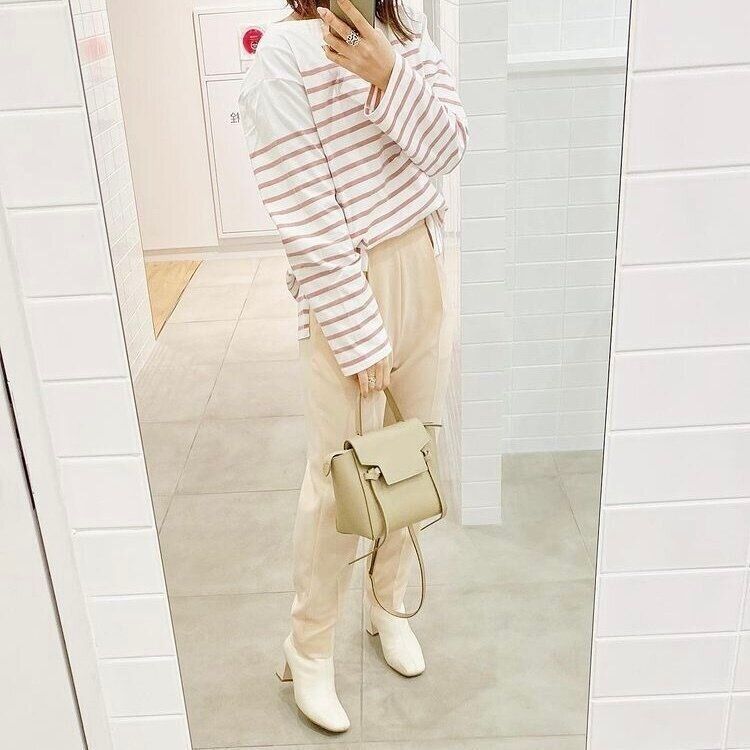 大ヒットしているユニクロの「ボーダーオーバーサイズT/1,290円」は薄いトーンのピンク色なので、「ピンクコーデ」に挑戦するのにぴったり。合わせるべきアイテムは、デニムも素敵ですが、上品見えを狙うなら、ベージュトーン。柔らかな印象へと導いてくれて◎。カジュアルが苦手な人でも上手にボーダーコーデを着こなすことができます。