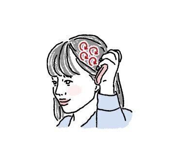 (2)側頭部の頭皮にブラシの先を押し当て、上の図のような向きで小さな円を描いては移動を繰り返す。