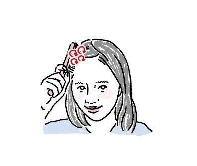 (3)前髪の生え際にブラシの先を当て、小さな円を描いて隣へと移動。最後に頭の前と後ろから頭頂へとかす。