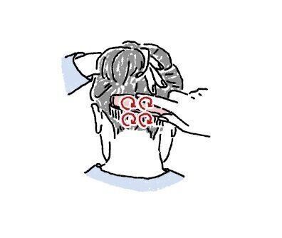 (1)後頭部の頭皮にブラシの先を押し当て、上の図のような向きで小さな円を描いては移動を繰り返す。