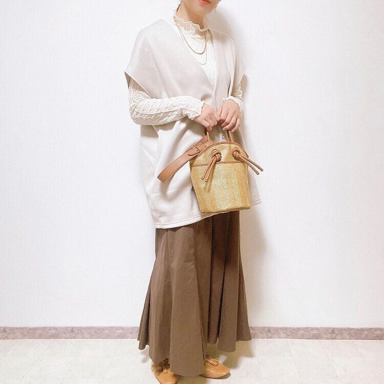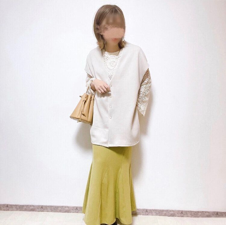 レディライクな印象が強いマーメイドスカートは少しハードルが高い人でも、「HRダンボールジレ」を合わせることでカジュアルダウンできるのでファッションに取り入れやすくしてくれます。
