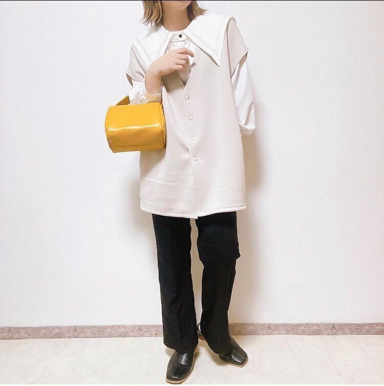 人気の大きなえりのブラウスは幼いイメージもありますが、ジレを合わせることで大人っぽさをプラスしてくれるのでブラウスのデザインを楽しみつつ、アラフォーでも自然に着こなす手助けもしてくれますね。