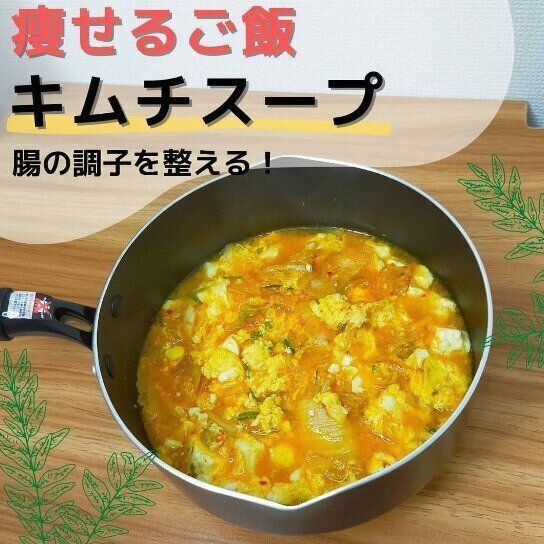 簡単でとってもおいしいスープをご紹介。フライパンにキムチ、刻みネギ、ゴマ油を適量入れて炒めます。豆腐1個を大きめにちぎって入れて、水を適量入れます。沸騰したスープにとき卵1個を入れてできあがり!