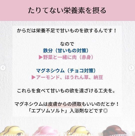 甘いものが食べたくなるのは鉄分不足の可能性があります。だから、野菜といっしょに肉(赤身)などを意識的にとってみる。またチョコレートが無性に食べたくなるのはマグネシウム不足のことも。アーモンドやほうれん草、納豆などを食べて、体が欲している必要な栄養素を補ってあげましょう。