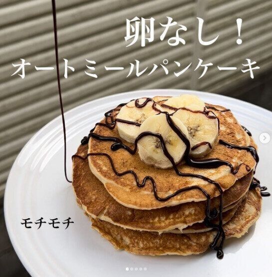 こちらは「オートミールパンケーキ」。つくりかたも簡単です。オートミール粉30g、豆乳30g、豆腐100g、自然派甘味料(ラカント)15g、ベーキングパウダー3gを混ぜて、フライパンで焼けばできあがり。