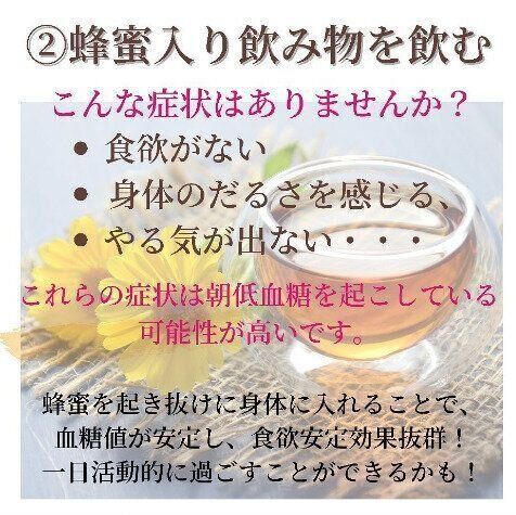 朝起きて、食欲がない、体のだるさを感じる、やる気が出ない…低血糖を起こしている可能性があります。そんなときは、ハチミツ入りの飲み物を飲んでみましょう。血糖値が安定し、食欲安定にもつながります。1日を活動的に過ごしていきたいですよね!