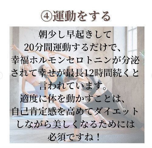 朝、少し早起きして20分間、体を動かすだけで幸せホルモンともいわれる「セロトニン」が分泌され、幸せが最長12時間続くとも言われているのだそう。適度に体を動かすことは自己肯定感を高め、ダイエットをしながら美しくなるためには必須なのだそうですよ!