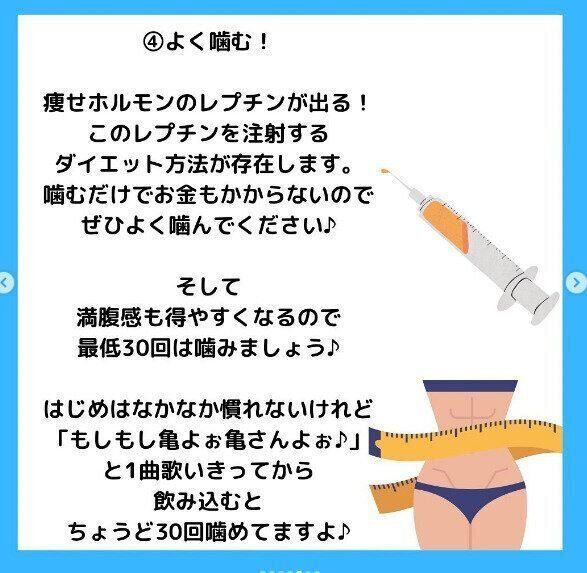 カロリー計算は面倒なのでしていないというzubora_yaseko_さん。食事で大切なことは、血糖値を上げないことと、栄養素をまんべんなくとることと言います。そして食べるときには「よく噛むこと」が何より重要なのだそう。食事のときは最低30回は噛むようにしてみましょう。「もしもし亀よ~亀さんよ~」と歌いきってから飲み込むと30回噛めるのだそうですよ。満腹感が得られるだけでなく、しっかり噛むことで「痩せホルモン」まで出てくるのだとか!
