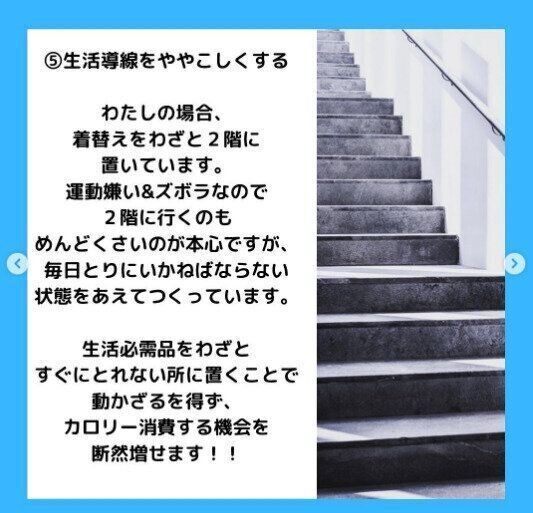 運動が嫌い!というzubora_yaseko_さん。でも、日々動くことを意識づけるために、「生活動線」をわざとややこしくしているというのです。着がえなど生活必需品は、わざと家の2階に置いているのだとか。これで、階段を上がったり、降りたりと軽い運動がどんなに面倒でもできてしまうのです。