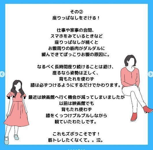 なかなか落ちない下腹のお肉。その解消法のひとつとしてzubora_yaseko_さんが日々意識していることが「座り方に気をつける」ということ。座るなら姿勢は正しく、背もたれは使わず、ひざは必ずつけること。たとえ映画館に行っても、背もたれは使わず、ひざをくっつけてプルプルしながらもがんばっていたそう。筋トレなどをしたくないがための究極のズボラトレーニングなのです。