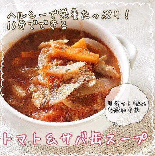 10分でできるヘルシーレシピを教えてもらいましょう。こちらは、「トマト&さば缶スープ」です。食べ過ぎた次の日の「リセット飯」にもいいそうですよ。