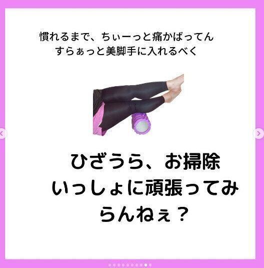 食事管理を中心に、時間をみつけては自宅で体を動かすことを欠かさないyy.piero0704さん。SNSでも、「懐メロ」に合わせてキレッキレのダンスを披露されています。最近のおすすめはこちら。脚やせのために、フォームローラーをつかってひざ裏をぐりぐりとマッサージ。ひざの裏は「老廃物のゴミ箱」と呼ばれるくらい老廃物がたまりやすいのだそう。yy.piero0704さんいわく、「慣れるまでちぃーっと痛かばってん」らしいのですが、老廃物のゴミ箱、これは流すしかないでしょう!
