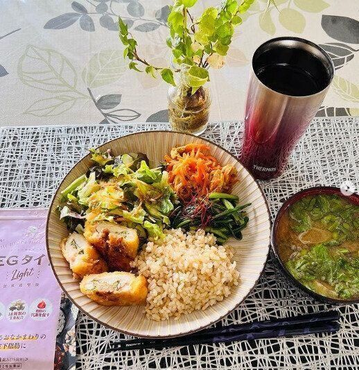 栄養バランスを重視した食生活を続けているyy.piero0704さん。食事は基本的にワンプレートにすることが多いそう。1皿に盛ることで栄養バランスもわかりやすいのだとか。写真はある日のランチ。野菜はたっぷり、タンパク質、炭水化物もしっかり。そこにお味噌汁もついています。体も心も大満足で、お昼からも元気にがんばれそうです。
