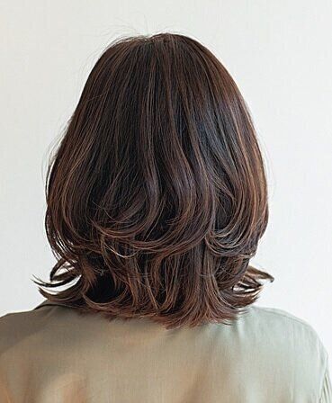 ベースは鎖骨の位置でカット。表面にレイヤーを入れて、動きを出す。前髪は真ん中部分をワンレングスにし、サイドバングを作る。さらに、アッシュ系カラーで立体感とツヤをプラスして品よく。