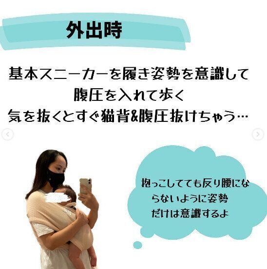 赤ちゃんを抱っこしながらのお散歩。この時間も逃しません。aimama_sangoさんのおすすめは、腹圧を意識して生活をする、つまりお腹をへこませながら呼吸をすること。姿勢の改善、ぽっこりお腹の改善、腰痛の予防にもつながるのだそう。