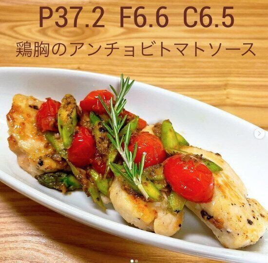 まずは、皮なしの鶏むね肉150gに塩こしょうをふり、オリーブオイルを熱したフライパンで焼きます。油の残ったフライパンにオリーブオイル小さじ1、アンチョビフィレ3枚、おろしにんにく小さじ1、ミニトマト6個、アスパラガス20g、ドライハーブを適量入れ、トマトが軽く崩れるまで炒め、さきほどの鶏肉にかけたらできあがり!