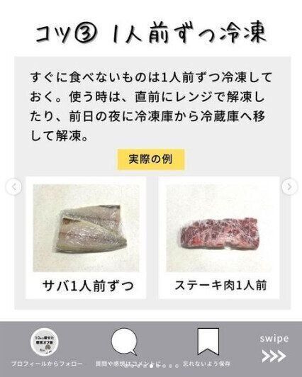 写真のように魚や、お肉は1人前ずつラップして冷凍保存しておくとさらに便利。使うときは直前にレンジで解凍したり、前日の夜に冷凍庫から冷蔵庫へうつして解凍します。ひとりだけのお昼ごはんのときも便利ですよね。