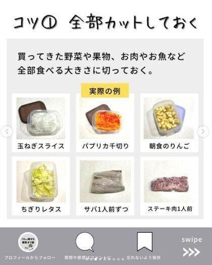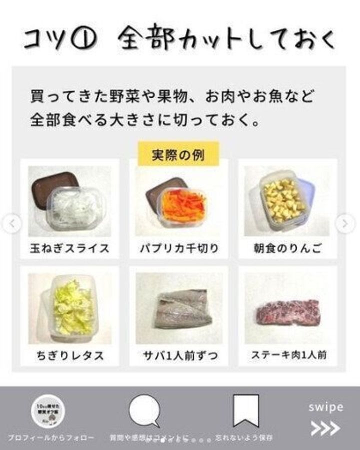 ひとつめは、買ってきた野菜や、果物、お肉やお魚もすべてカットしておくのがポイント。使いたいときにさっと取り出せるので調理の時短につながります。