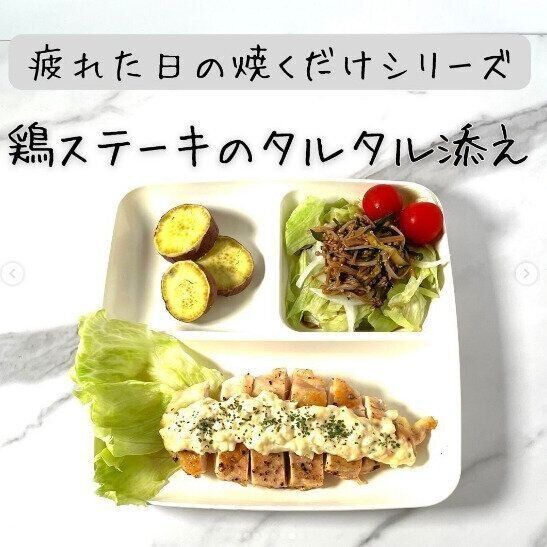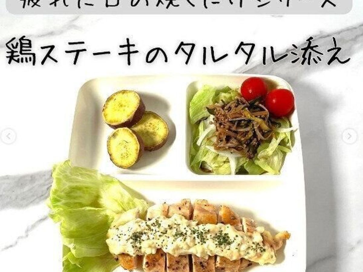 焼いたお肉にタルタルソースをかけて、休日に準備しておいた副菜、ちぎったレタス、蒸したさつまいもなどを添えれば、栄養バランスのとれたヘルシープレートができあがり!