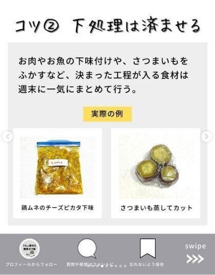 お肉やお魚は、下味をつけて保存袋に入れておくのもおすすめ。食べたいときにさっと焼くだけなので便利ですよ。またお気に入りの食材があるのなら、先に下処理だけでもしておきましょう。さつまいもなどは蒸してカットしておけば使いやすいですね。