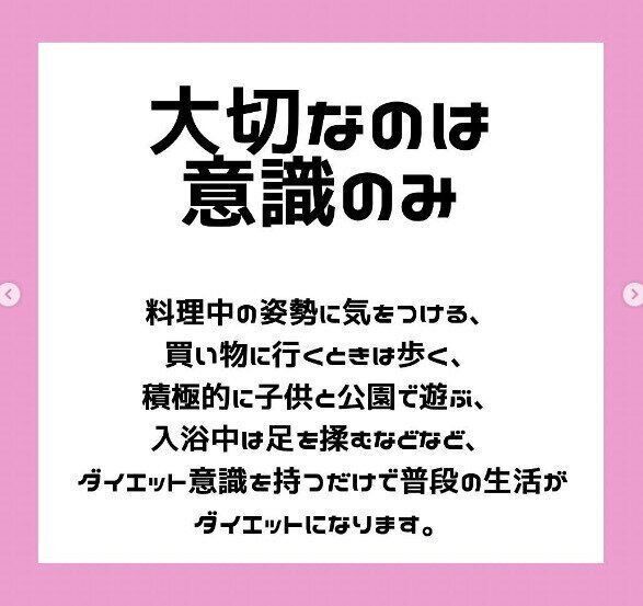 「大切なのは意識のみ」とdiet_yuranonさんは言います。子育て中のママが、今の生活にダイエットの時間を組み込もうなんてそもそも無理。結果的に挫折してしまうことにもつながるのです。だからこそ、ふだんの生活のなかで意識して体を動かす、入浴中は脚をマッサージなど、日常が自然とダイエットになっていくことを目指していきましょう。