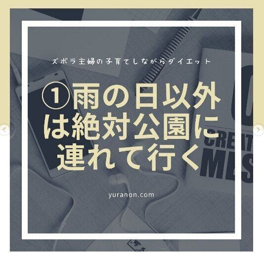 ダイエットをすると決めてから、diet_yuranonさんが自分に課したルールは3つ。まずは、雨の日以外は子どもを絶対に公園に連れていく、ということ。1日5,000歩を歩くことを目標に、子どもと一緒に公園へ。遊ばせることもでき、自分の有酸素運動にもなって一石二鳥だそうです!