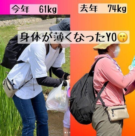 こちらが、e_slat_namekoさんのビフォーアフター。去年と比べると、現在13kgのダイエットに成功中です!体の厚みがまったく違いますよね。たった1年でここまでの変化に驚きです。