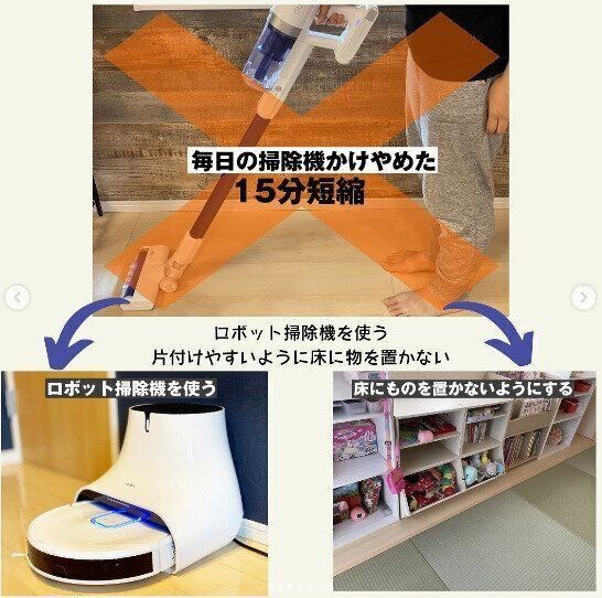 こちらは拭き掃除もできるロボット掃除機の例。毎日の掃除機がけにつかっていた15分は、ロボット掃除機にたよることで0分に。そして水ふきも可能なので、毎日の10分の床ふきもなくなりました。これで、毎日、合計25分が生み出されたのです。