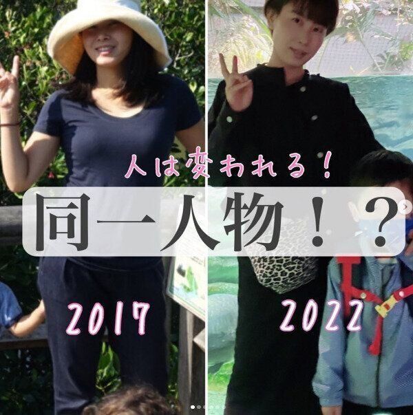 こちらはビフォーアフターの写真。全体の印象がまったく違いますよね。子育て中に、ここまでのダイエットに成功したことに驚きです。食生活の改善や生活習慣を整えたことで大きく変わったと言いますが、じつは体だけでなく、心までもすっきりしたと言います。