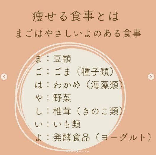 栄養バランスを簡単に意識するには、「まごわやさしいよ」の食事です。豆類、種実類、海藻類、野菜、さかな(魚介類)、きのこ類、いも類、そして発酵食品です。バランスの良い食事といえば、和食、一汁三菜がおすすめなのだそう。きちんと食べることで体も元気に、きれいに痩せていくそうですよ!